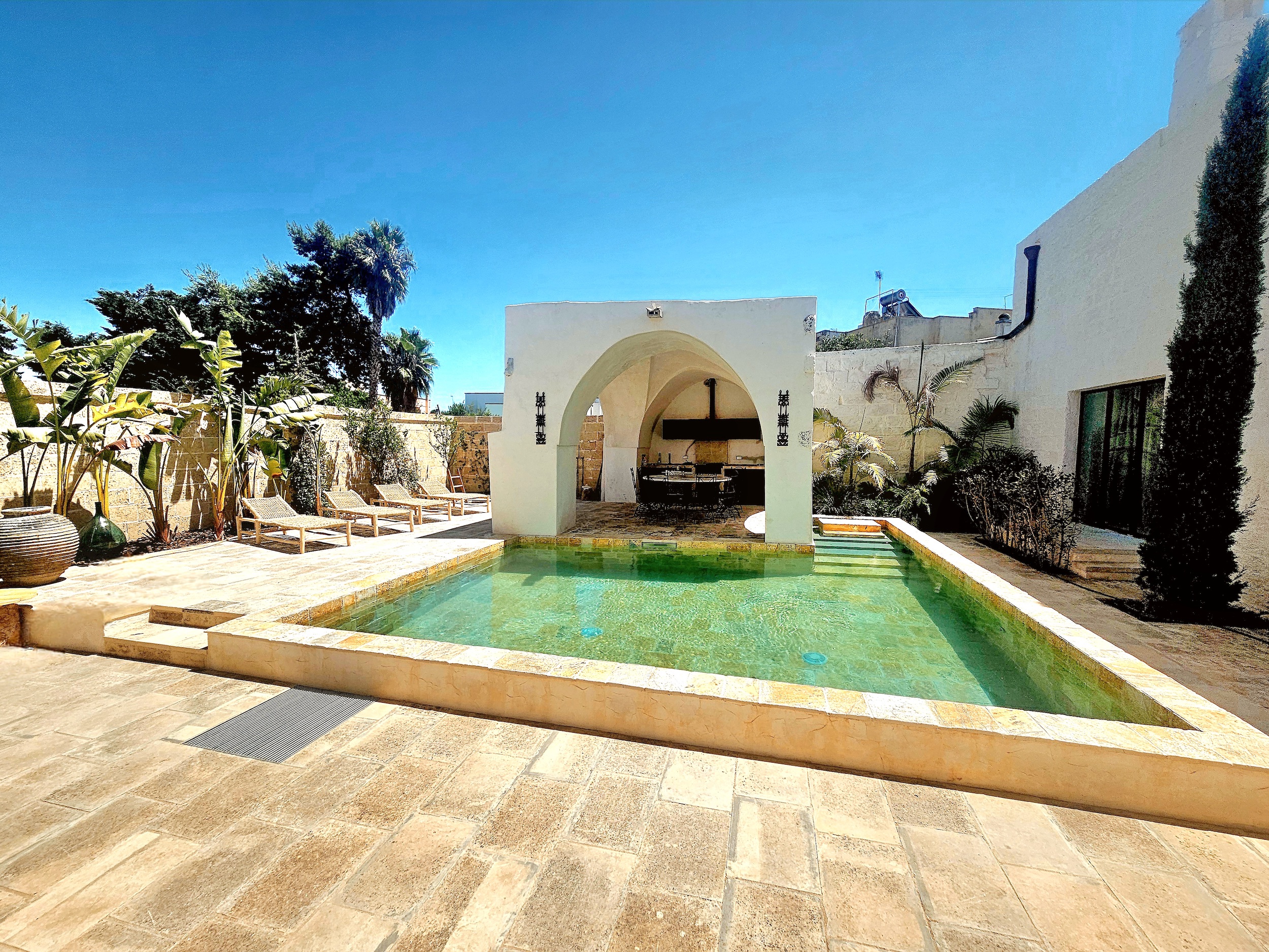 61 Step into the timeless allure of Masseria Fontana, an 18th-century estate reborn with refined rustic elegance. Nestled in the tranquil village of Gemini and just minutes from the turquoise beaches known as the “Maldives of Salento,” this historic property, dating back to the 18th century, invites you to slow down, unwind, and embrace La Dolce Vita, the Italian art of savoring life. Best for: Families and group of friends Enquire now Gallery Location Highlights Description Rates & Terms Photo Gallery Location Brindisi Airport: 110Km Bari Airport: 230Km How to get there Just a short ten-minute drive away, the turquoise shores of the “Maldives of Italy” beckon — a paradise of crystal-clear waters and refined beach clubs, where Masseria Gemini can curate exclusive experiences in collaboration with a select local partner. At Masseria Fontana, you’re invited to uncover the timeless beauty of Apulian life through bespoke, private experiences — from mastering traditional cuisine to exploring the delicate artistry of pottery, weaving, and local hand-knitting, or embracing serenity with yoga sessions immersed in nature. Surrender to these soulful moments, where every movement and flavor tells a story, and every breath lingers as an unforgettable memory. Nearest sandy beaches: 8Km Amenities BBQCinema roomWalking distance to villageWine cellar Property details Once a cluster of humble dwellings, the masseria has been meticulously restored to blend contemporary luxury with authentic Apulian charm. Every stone and arch has been preserved with reverence, creating a sanctuary where history, design, and well-being coexist in perfect harmony. At its heart lies the grand central hall — once the village thoroughfare, now a luminous open space that bridges past and present. The living area features a restored original fireplace, a cozy lounge, and a dining table for twelve. The open-plan kitchen, anchored by a monumental island in local stone, is ideal for long, convivial meals and lively conversations. A private movie room with a large screen completes this inviting communal space, perfect for intimate evenings in. Throughout the property, every detail tells a story: centuries-old doors, hand-carved stone sinks, woven straw chandeliers, and handcrafted ironwork — all locally sourced and restored to honor the building’s soul. Floor-to-ceiling glass doors open onto the backyard and pool area, seamlessly blending indoor comfort with outdoor serenity. The house offers four independent suites, each with a private bathroom, uniting natural textures, artisanal furnishings, and modern comforts. A fifth double room can also serve as an elegant study or workspace. The master bathroom is a masterpiece — centered around a majestic 900-kg stone bathtub sculpted by local artisans, embodying intimacy and timeless beauty. As the sun sets, the indoor/outdoor bar — with its softly lit *cantinette* and cocktail counter — transforms into a haven for unhurried conversations and toasts with exquisite Apulian wines. Outdoors, life unfolds to the rhythm of La Dolce Vita beneath stone pergolas and among fruit trees, a natural-stone pool with a gentle waterfall invites lingering summer afternoons. The outdoor kitchen and dining pergola set the stage for long dinners under the stars, surrounded by candlelight and the scent of citrus. Upstairs, a panoramic 350-square-meter terrace opens to boundless skies — a private retreat for yoga, meditation, or open-air massages. An elegant pergola shades a plush lounge area, ideal for sunset cocktails or stargazing. A secluded solarium with an outdoor shower completes this haven of relaxation and privacy. Every corner of Masseria Fontana has been curated with meticulous attention to detail — where natural materials, handcrafted furnishings, and understated luxury come together to create a truly soulful atmosphere. CIS: LE07509042000030922 CIN: IT075090B400119763 Bedrooms Configuration 2 double bedrooms 1 French bed 4 single beds. Facilities and Services All towels and linen, Yoga mats, Crib and high chair, A/C throughout, Central heating, Fireplace, BBQ, Home cinema, Sound system, Hairdryer in each room, Sat TV with Netflix, 2 Washers and 1 dryer, Gated property, Private parking for 2 to 3 cars, Stylish bar with cantinette Additional housekeeping, Laundry service, Additional linen change, Pre-stocking of fridge, Chef service (breakfast, lunch, dinner), Airport transfers, Yoga, Massages, Personal Trainer, Babysitting, Guided tours. Exceptional Services All towels and linen, Yoga mats, Crib and high chair, A/C throughout, Central heating, Fireplace, BBQ, Home cinema, Sound system, Hairdryer in each room, Sat TV with Netflix, 2 Washers and 1 dryer, Gated property, Private parking for 2 to 3 cars, Stylish bar with cantinette Pool and Spa 6 x 4 m. Max depth 1.4m. Pool mini fridge. Special Touches Special beach club rates. Stylish bar with cantinette. Rules Small children No pets. No smoking inside the house. No parties. Rotate your device to view the rates table. Rates 2026 PeriodRates per NightRates per WeekMin Stay Jan to April€500€35004 May€625€43754 30 May to 26 June€61757 27 June to 28 August€70007 September€800€56005 October€600€42004 November and December€500€35004 Christmas and New Year seasonUpon RequestUpon Request Booking Conditions Included in the rate: - Welcome Apulian Basket - Pool & garden maintenance - Utilities (water, gas) - Luxury toiletries - Beach towels - Wifi - Priority access to local Beach Club Not included in the rate: - Final cleaning cost of €250 to be paid upon arrival - Heating and electricity based on consumption - Tourist tax - Refundable security deposit: €1500 Check-in: 4.00pm to 8.00pm Check-out: 10.00am Cancellation Policy For our Cancellation Policy please refer to our Booking Conditions: https://passepartout-homes.com/booking-conditions/. Terms A non-refundable deposit is required in order to secure a 
