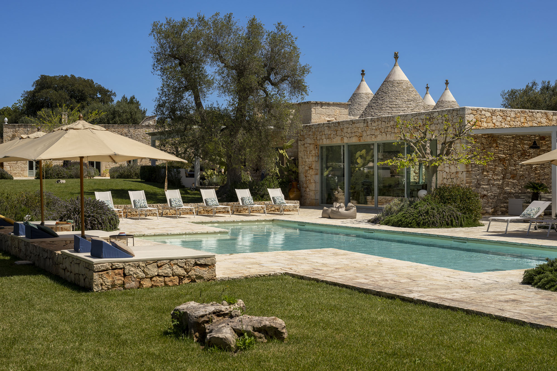 1.5K Ostuni Art is phenomenal example of local rural architecture, where former rural housing has been renovated and restored with quality and fine materials, equipped with every comfort, whilst maintaining the original character. Unique, in that three separate buildings, conceived as three separate environments, come together to create one extraordinary setting. Best for: Families, small group of friends, and more Enquire now Gallery Location Highlights Description Rates & Terms Photo Gallery Location BY AIR Brindisi Airport: 37Km Bari Airport: 100Km How to get there The resort is located approximately 5Km from the centre of Ostuni, also know an "the White City" for its whitewashed buildings. Amenities GymPizza oven Property details Ostuni Art is composed of three homes: The Trulli, The Lamia, and The Saraceno. In total, across the resort, there are 7 bedrooms, 2 kitchens; 3 living rooms (one of which is very large); and various outdoor spaces that revolve around the large swimming pool. The Trulli is established around the ancient structure of the same name. Trulli are traditional structures made of carved stone and pointed-dome roofs and thick walls, with open, round floor plans, evoking another time. The Trulli is composed of 4 Trulli, and offers two large double bedrooms, two bathrooms, living room, and kitchen. The expansive living room overlooks the pool and features a fireplace - perfect for cool evenings in the off season. A renovated farm building with five trulli create The Lamia, which is the backbone of the resort, offering spacious bedrooms and bathrooms, each individually designed and equipped with the most modern comforts. The Lamia is composed of 4 bedrooms with ensuite bathrooms, and can accommodate 10 guests: 3 double bedrooms and 1 quadruple (2 bunk beds). The Saraceno, also called the Tower of Ostuni, is discreetly tucked away and boasts its own veranda. Exceptional for its size, this home is equipped with a kitchen, bedroom and bathroom. From the terraced dome-roof, take in the olive groves and flowering grasslands enveloping the resort - perfect for relaxation or to sunbathe. There is an additional double bed in the living area. Like everywhere in the South, life takes place mainly outdoors at Ostuni Art, where the outdoor areas are a place to come together or to have moments of private contemplation. Relax on the stylish loungers by the pool or sunbathe on the masonry sun beds; hang out on the casual bean bags; sit in the garden; share a pizza fresh from the outdoor pizza oven in the pergola; explore the olive grove; and keep in shape in the gym housed within the pool house. Bedrooms Configuration IL TRULLO 2 double bedrooms (king size) with en-suite bathroom. 2 additional single beds can be added in the Trullo, if required. This unit also contains a living room and a kitchen. Tot capacity: 4 +2 LAMIA 3 double bedrooms (king size with en-suite bathroom 1 quadruple bedroom with bathroom: two bunk beds Entrance hall Tot capacity: 10 SARACENO 1 double bedroom (king size) 1 bathroom 1 living area with one double bed (king size) 1 kitchen Tot capacity: 2+2 CABIN 1 double bedroom (king size) 1 bathroom Tot capacity: 2 Facilities and Services A/C throughout, Additional single bed is available upon request, Private parking, Washing machine and tumble dryer, Stereo, Printer, PC, Pizza oven, Foosball table, Ping-pong table, Built-in safe, Dishwasher Custom-made services and experiences. Enhanced housekeeping services and laundry service. Private chef for lunches, dinners, pizza and BBQ parties, Musician and dancers, Cooking classes on site, Apulian wine tastings, Cheese making, Massages and beauty treatments, Yoga, private transfers and car hire. Pool and Spa Pool 16×5 (max 7,5) and pool house. The well-equipped gym is inside the pool house where you can find a treadmill, exercise bike, weights, and floor mats. There is also a ping-pong table outside. Special Touches Over time, Ostuni Art has become the home of an extraordinary art collection. The presence of contemporary art enlivens and stimulates the atmosphere of the resort. Rules No smoking inside the house. No pets. Parties possible prior consent. Rotate your device to view the rates table. Rates 2026 PeriodUp to 8 Guests Standard per NightUp to 14 Guests Standard per NightUp to 8 Guests Fully Staffed per NightUp to 14 guests Fully Staffed per NightMin Stay 28 February to 27 March€1260€2200€1700€30003 (no arrival on Fridays and Sundays) 28 March to 1 May€1500€2700€2000€35003 (no arrival on Fridays and Sundays) 2 to 29 May€2000€3500€2450€44003 (no arrival on Fridays and Sundays) 30 May to 26 June€28500/week€34500/week7 27 June to 28 August€30800/week€36750/week7 29 August to 26 September€24500/week€30450/week7 26 September to 31 October€1500€2700€2000€35003 (no arrival on Fridays and Sundays) November€1260€2200€1700€30003 (no arrival on Fridays and Sundays) Booking Conditions Refundable security deposit: €2000, to be paid cash on arrival. Wedding and party fees: up to 70 ppl from 2.500€ – over 70 ppl on request. Standard services: • Welcome pack • Continental breakfast from 8.30am to 10.30am (hot food on request) • Daily rooms tidy up service • Cleaning service with change of towels and sheets on Wednesday • Pool and garden maintenance once a week • Free wi-fi Internet (indoor and outdoor) • High definition TV, Netflix, Amazon Prime • Air conditioning • Hairdryer • Selected toiletries • Gym • Honesty Bar Fully Staffed: • Welcome pack • Continental breakfast from 8.30am to 10.30am (hot food included) • Lunch & Dinner for 7 days (daily personalised menus) – food and drinks shopping expense to refund at the end of the week with 10% of handling charge • Picnic lunches can be provided for taking to the beach or excursions • Daily maid service from 11am to 1pm • Change of towels twice a week – change of sheets on Wednesday • 